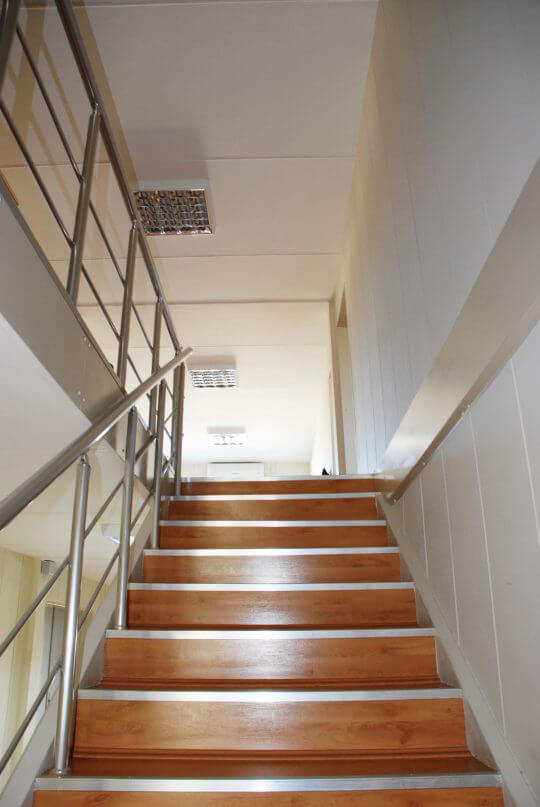 Комбинированные контейнерные блоки обладающие стандартными свойствами по внешней структуры, спроектированы в двухэтажном ввиде на площади 550м2. Здесь расположены высшие административные офисы, а также рабочие зоны, используемые в качестве открытого офиса, кухни, влажные помещения и т. д., Огнеупорный волокнистый материал класса А1, используемый для внутренней отделки стен, применяется в перпендикулярном виде в размере 50 × 260 см . Благодаря этой детали скрываются дополнительные места и обеспечивается эстетичный, и целостностный вид.